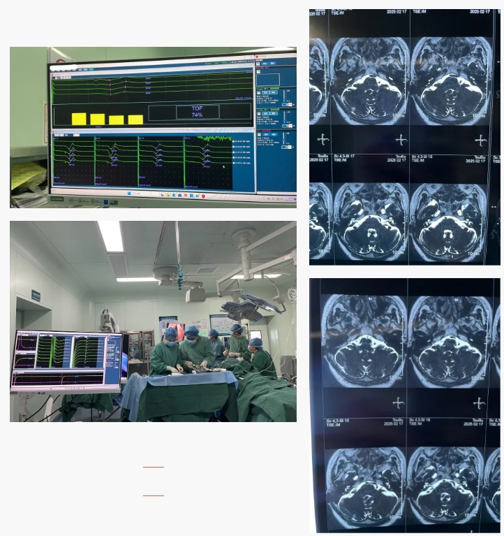 60岁的李阿姨(化名)近4年来饱受左侧面部肌肉不自主抽搐的困扰,频繁的“挤眉弄眼”让她在社交场合倍感尴尬,甚至不愿出门。辗转多家医院、尝试多种药物后,症状仍未缓解。最终,她来到我院神经外科寻求手术治疗。 手术室里,神经外科团队的显微镜下,一根异常搏动的血管正紧紧压迫着59岁张阿姨(化名)的面神经根部。这位被左侧面部不自主抽搐折磨了4年的患者,此刻正在接受微血管减压手术的关键时刻。 "准备解除压迫。"随着术者的指令,神经电生理监测医师孙畅紧盯着监测屏幕上的神经电生理信号。突然,一个戏剧性的变化出现了——当显微剥离子轻柔拨开压迫血管的瞬间,持续存在的异常肌反应(AMR)波形立即消失,原本紊乱的肌电图(EMG)信号也恢复了平稳的基线。"信号转归正常!"术中神经电生理医师立即报告。手术团队默契配合,顺利完成减压操作。术后李阿姨苏醒后惊喜地发现,困扰她多年的"挤眉弄眼"消失了,终于露出了久违的轻松笑容。