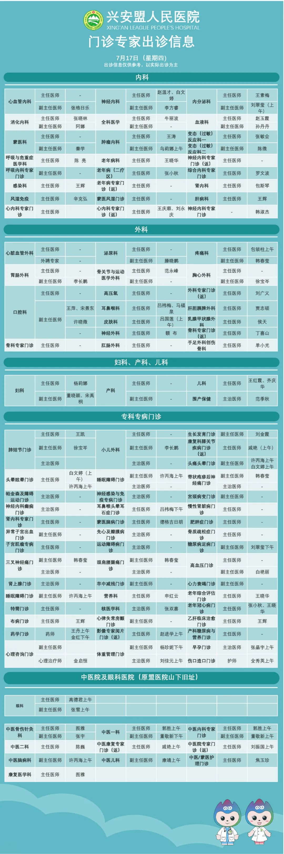 『出诊信息』兴安盟人民医院7月17日-18日出诊信息
