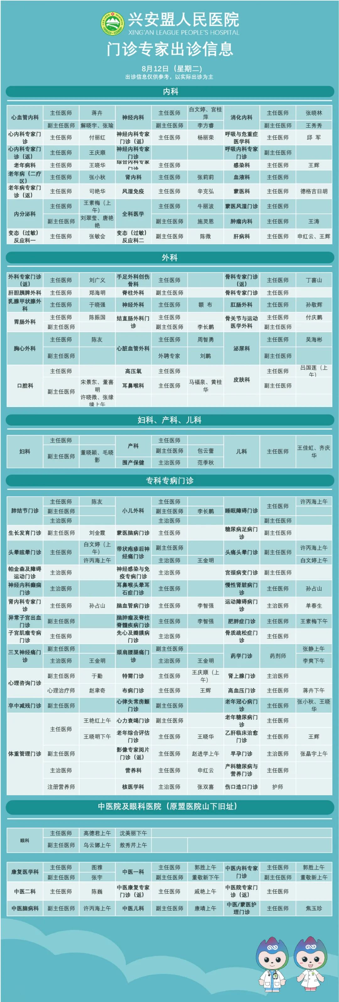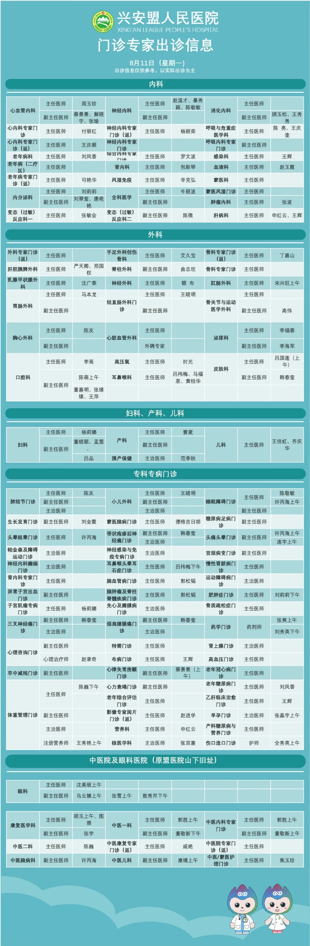 『出诊信息』兴安盟人民医院8月11日-13日出诊信息