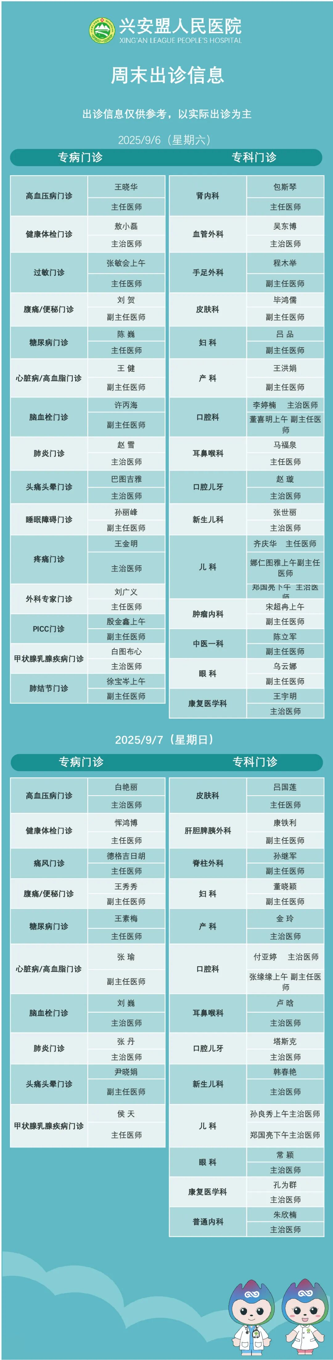 『出诊信息』兴安盟人民医院9月4日-5日出诊信息