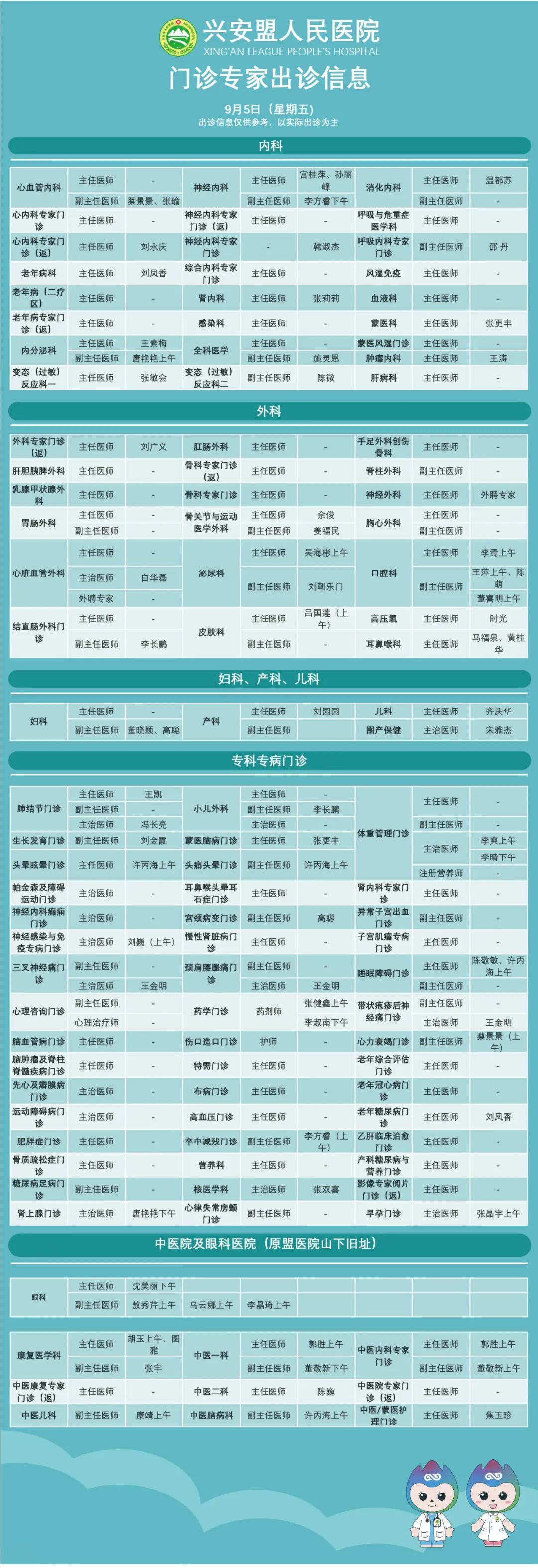 『出诊信息』兴安盟人民医院9月4日-5日出诊信息