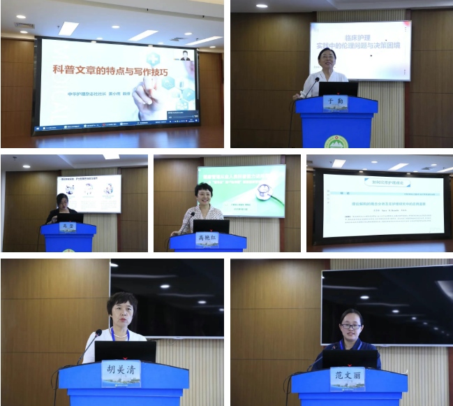 在学术交流环节,中华护理学会高等护理教育专业委员会主任委员姜小鹰、内蒙古自治区护理学会护理伦理专业委员会主任委员于勤、内蒙古自治区护理学会护理理论研究专业委员会常务委员周妹、内蒙古自治区护理学会健康管理委员会主任委员高艳红、内蒙古自治区护理理论专业委员会委员兼秘书高莹、内蒙古自治区护理学会健康管理护理专业委员会副主任委员胡美清、内蒙古自治区护理学会护理伦理专业委员会副主任委员范文丽分别做以《科普文章的特点与写作技巧》《临床护理实践中的伦理审思》《护理理论在护理科研中如何应用》《健康管理从业人员科普能力提升策略》《赋能与转化:护理理论临床应用模式探索与实践》《护理人员在健康管理领域中的责任与使命》《临床护理实践中患者隐私保护的伦理探讨》为题,分享了她们在该领域的最近研究成果与临床应用。她们结合临床实际案例,分享前沿观点与实践经验,为推动自治区护理团队的高质量发展注入了新的理念与动力。