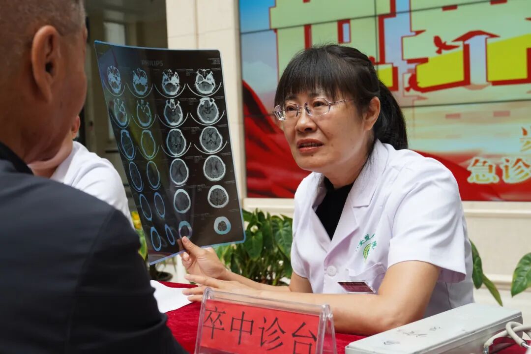 在卒中诊台前,王艳霞主任正在向一位中年女性讲解识别中风的"FAST"原则:"F代表Face(面部),看看笑容是否对称;A代表Arm(手臂),能否平行举起;S代表Speech(言语),是否清晰无误;T代表Time(时间),一旦出现症状立即拨打急救电话。"