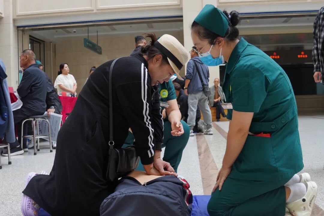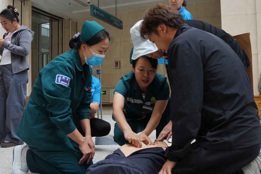 模拟人周围围满了好奇的市民,大家轮流上前实践,医护人员则在一旁细心指导,纠正每一个不规范的动作。