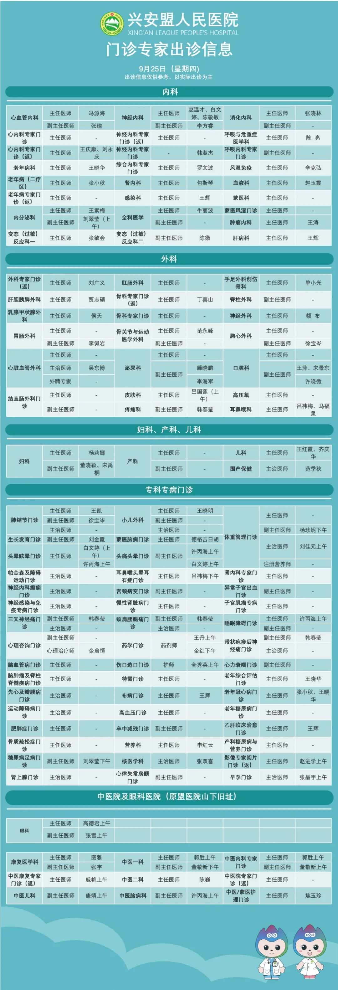 『出诊信息』兴安盟人民医院9月25日-26日出诊信息