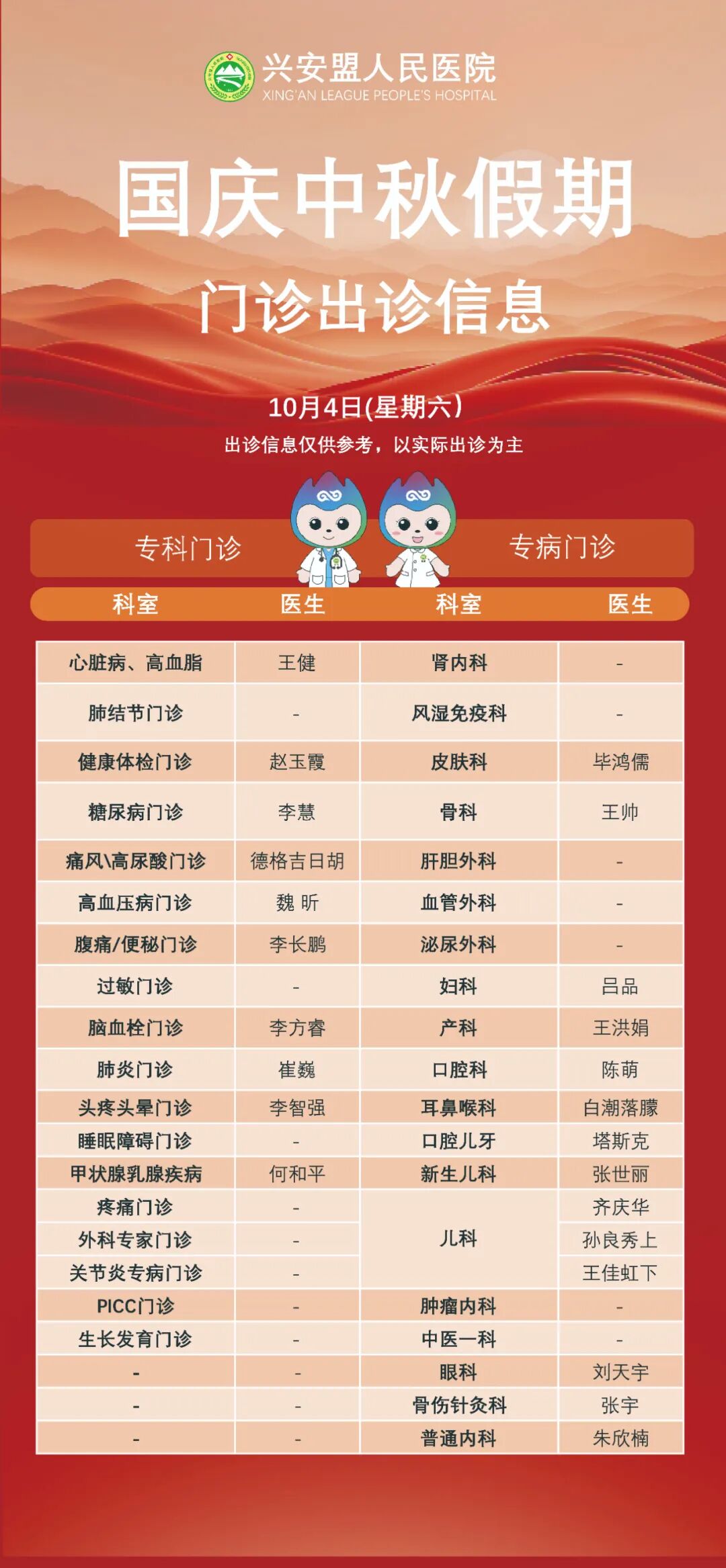 『出诊信息』兴安盟人民医院10月4日出诊信息