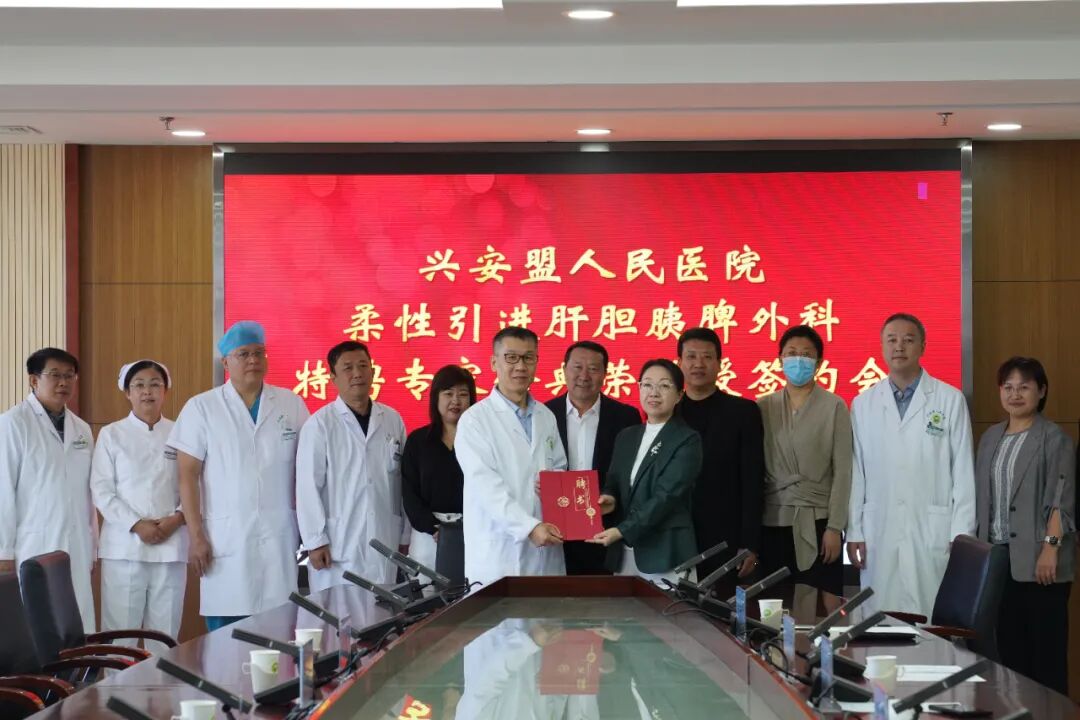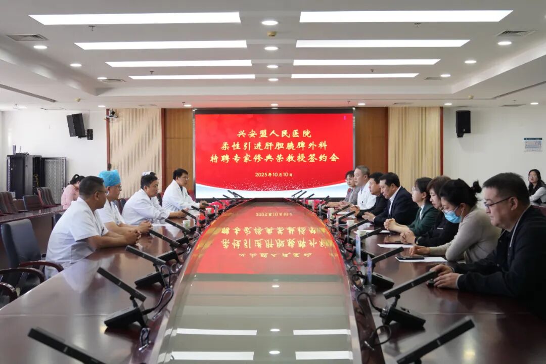 10月10日,兴安盟人民医院举行柔性人才引进特聘专家签约仪式,正式聘请北京大学第三医院普通外科主任、肝移植中心主任修典荣教授为医院特聘专家。院领导班子成员、肝胆外科医护人员及相关科室负责人出席仪式,共同见证这一推动医院学科建设的重要时刻。仪式由医院副院长周智勇主持。