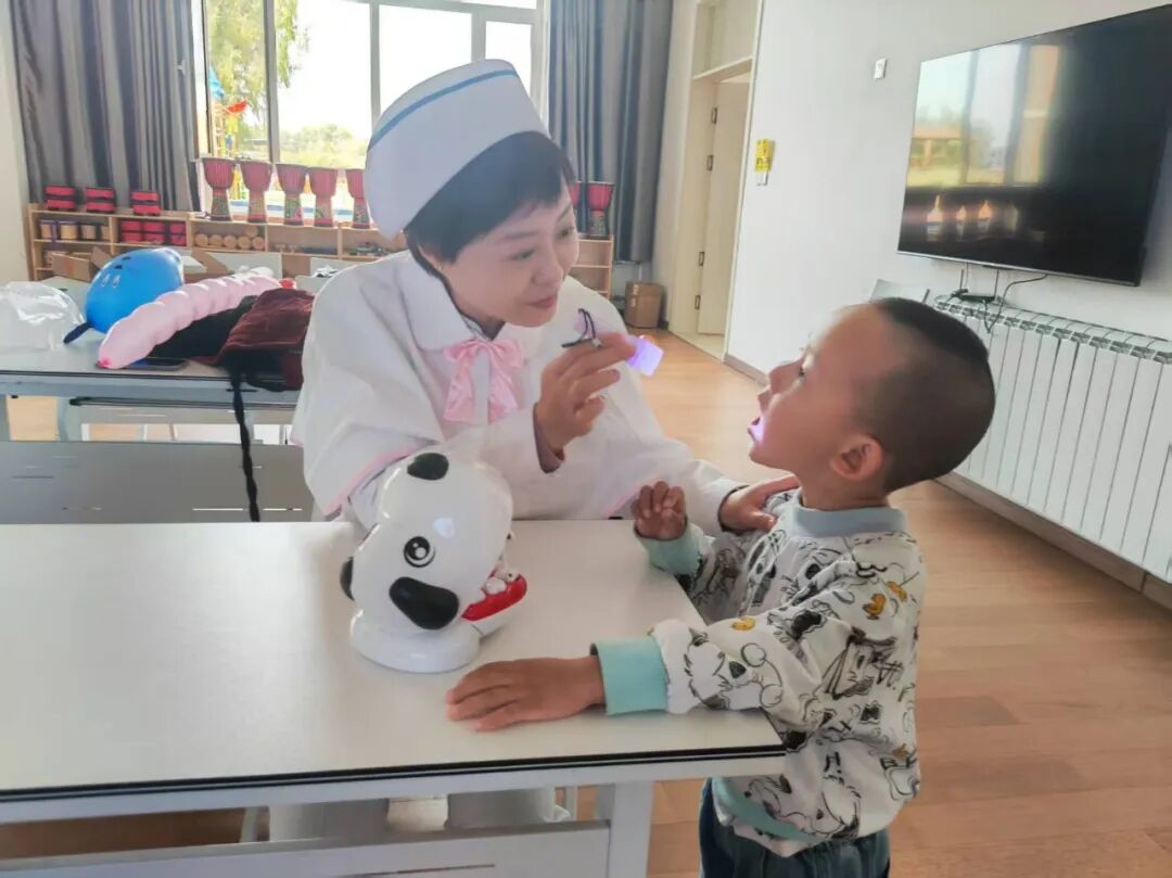活动以“9·20爱牙日”科普为开篇,志愿者首先带领幼儿观看科普视频,生动讲解刷牙的必要性,让孩子们直观认识到口腔健康的重要性。随后,志愿者带领幼儿做起趣味刷牙操,在欢快的节奏中,手把手指导孩子们掌握“巴氏刷牙法”的正确步骤,帮助他们养成良好的口腔卫生习惯。为减轻幼儿对牙科检查的焦虑与恐惧,志愿者还模拟了牙齿健康检查的就医场景,引导孩子们依次体验“就诊”流程,让他们在轻松氛围中消除对看牙的抵触心理。