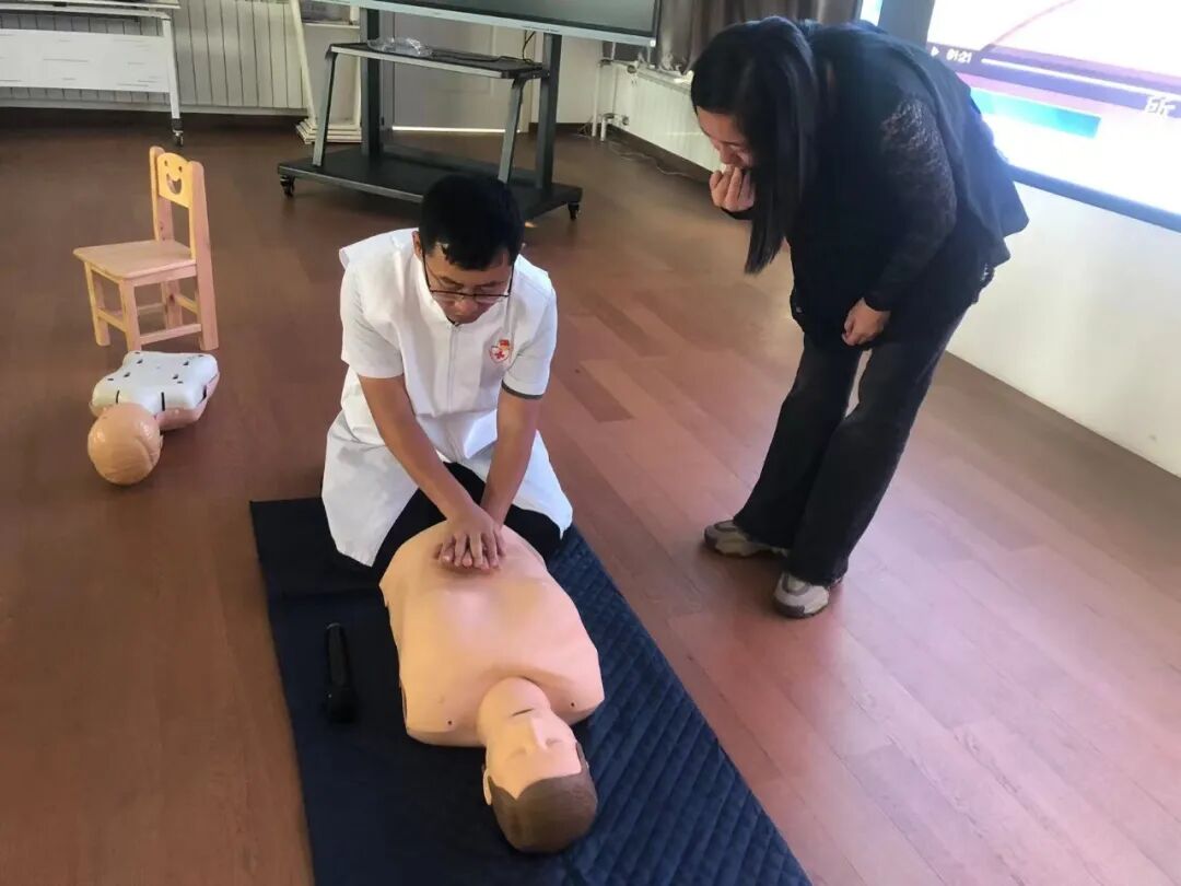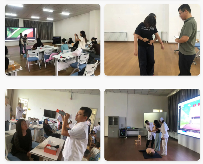 考虑到幼儿活泼好动、易发生噎食误吸的特点,志愿者团队专门针对这一高风险问题展开科普。通过图文结合的方式,志愿者向孩子们展示噎食误吸的不良后果,孩子们纷纷表示“知道不能把小珠子放嘴里”“吃饭要慢慢嚼”,初步建立起对误吸高危行为的认知。紧接着,医院男护士工作组的成员聚焦急救技能,向教师和保育人员系统讲解幼儿及成人海姆立克急救法的操作要点,同时示范心肺复苏的标准流程。现场教辅人员热情高涨,踊跃上前实践,在志愿者的指导下反复练习按压、吹气等动作,力求精准掌握每一项急救技能,为守护幼儿生命健康筑牢安全防线。