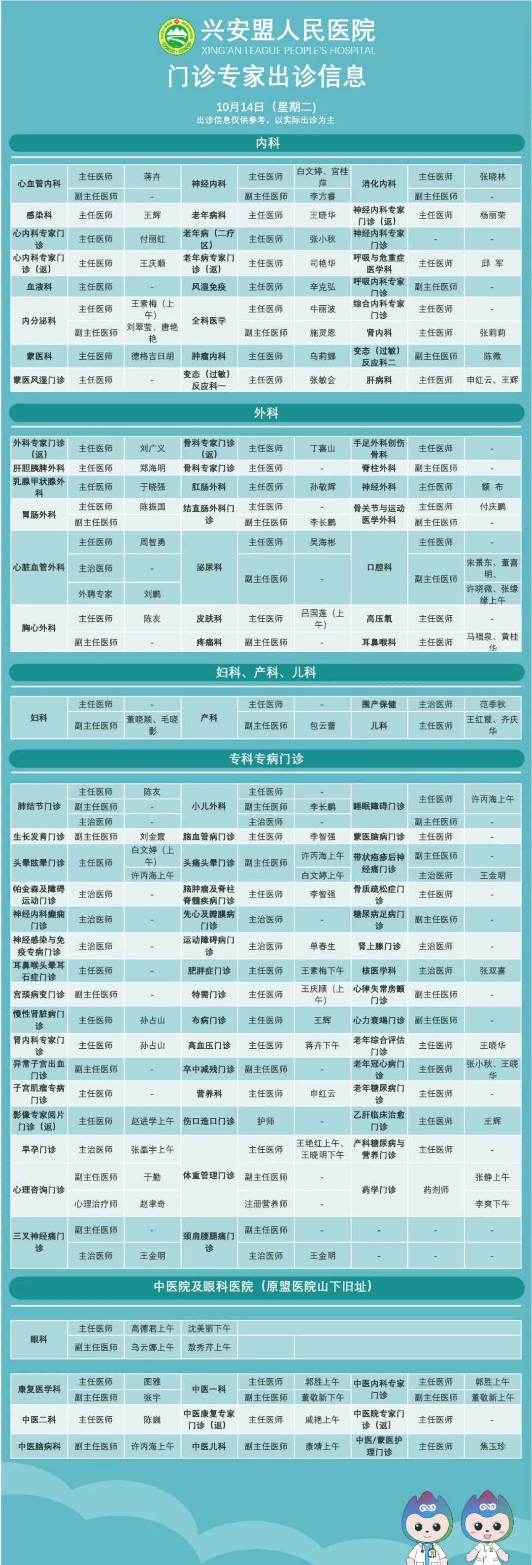 『出诊信息』兴安盟人民医院10月13日-15日出诊信息