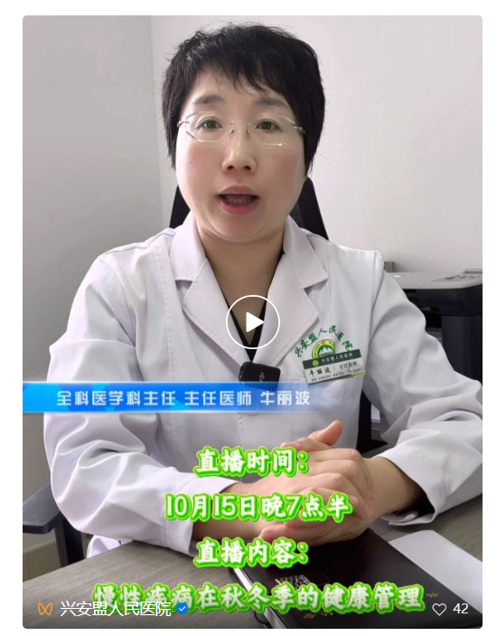 本期直播特邀兴安盟人民医院全科医学科主任牛丽波将为您带来慢病疾病在秋冬季健康管理科普直播!