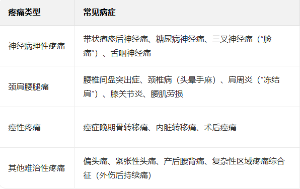 很多人误以为 “只是开止痛药的科室”,其实这是大大的误解!麻醉疼痛科针对的是治疗“各种难治性、不明原因的疼痛”的科室,尤其擅长用微创技术解决 “吃药不管用、手术不好做” 的疼痛问题,主要覆盖 4 大类: