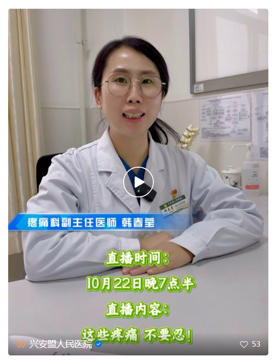 本期直播特邀兴安盟人民医院麻醉疼痛科副主任医师韩春莹将为您带来哪些疼痛不要忍,疼痛相关科普直播!