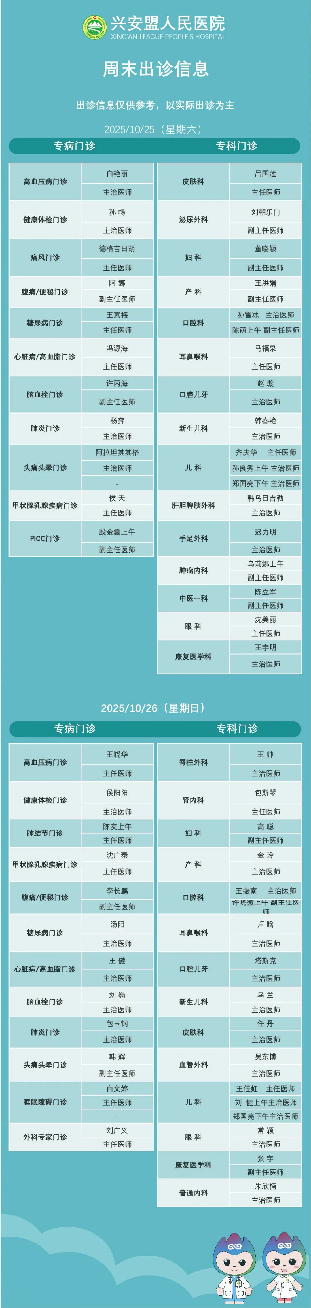 『出诊信息』兴安盟人民医院10月27日-29日出诊信息