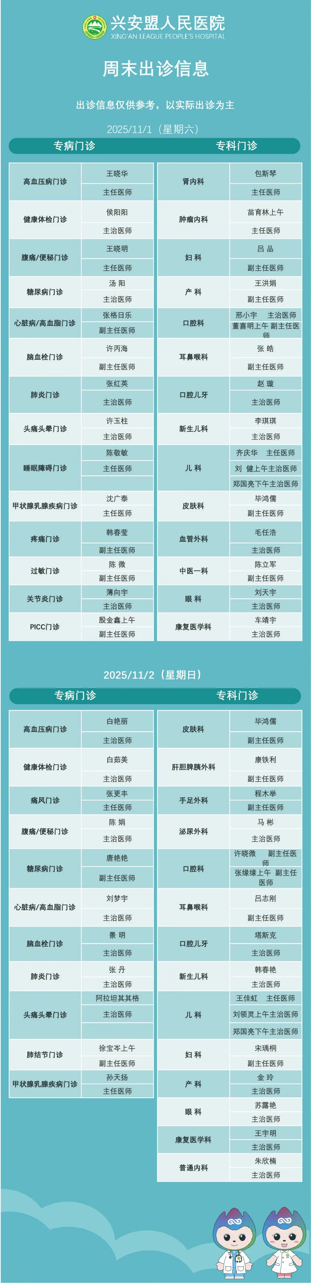 『出诊信息』兴安盟人民医院10月30日-31日出诊信息