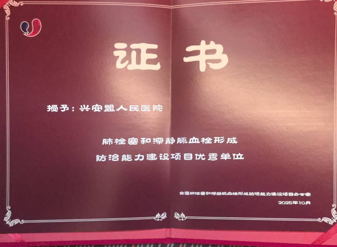 近日,兴安盟人民医院顺利通过国家VTE(静脉血栓栓塞症)防治中心线上评审,凭借扎实的静脉血栓栓塞症防治工作和突出的区域协同引领作用被评为“肺栓塞与深静脉血栓形成防治能力建设项目”优秀单位。这一国家级荣誉标志着兴安盟人民医院在静脉血栓栓塞症防治领域达到了先进水平。