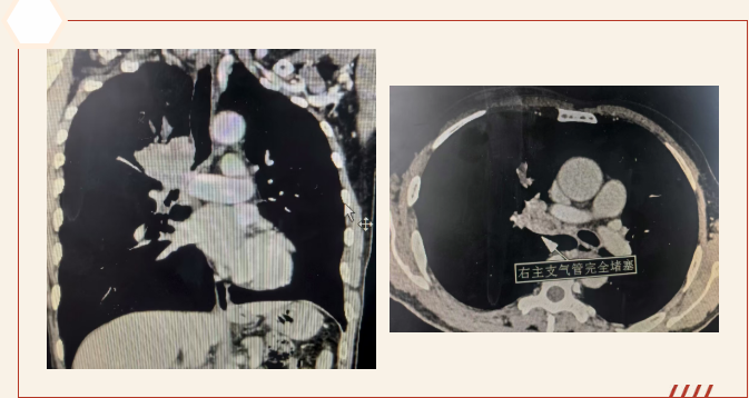 2个月前,此患者开始出现不明原因的呼吸困难,且症状逐渐加重。入院后完善检查,胸部 CT 显示右主支气管存在占位性病变;进一步支气管镜检查更明确 —— 右主支气管腔内被新生物完全阻塞,管腔狭窄程度竟达 90% 以上,右侧肺叶通气功能几近丧失。若不及时打通气道,不仅呼吸困难会持续加重,还可能引发肺部感染、呼吸衰竭等致命风险,更无法开展后续抗肿瘤治疗。