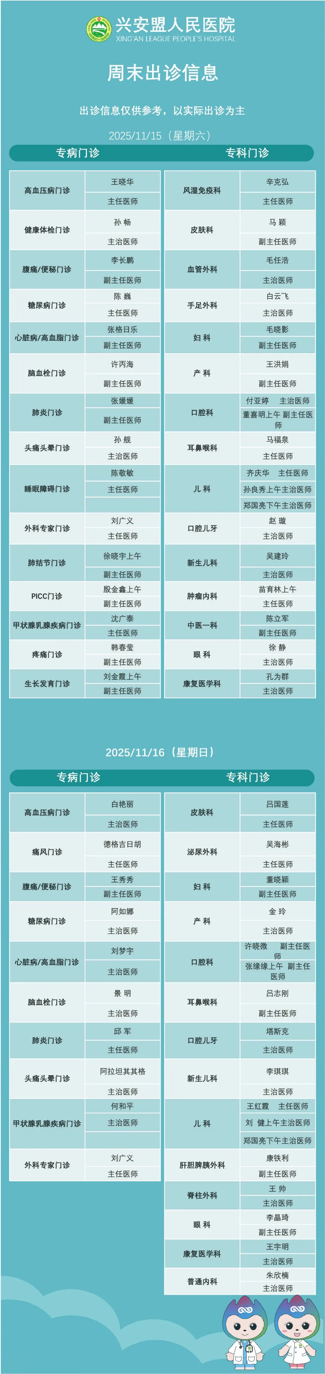 『出诊信息』兴安盟人民医院11月20 日-21 日出诊信息