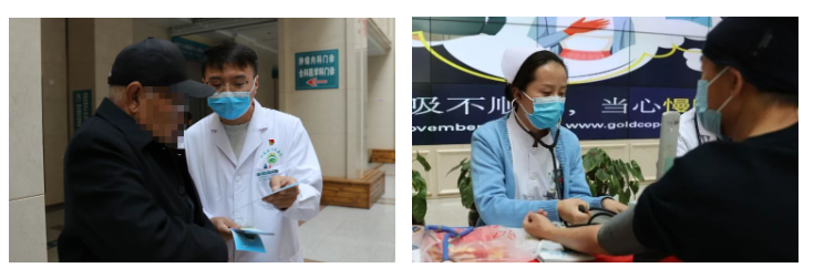 义诊现场,呼吸与危重症医学二科团队耐心接待每一位咨询市民,针对咳嗽、咳痰、气短等呼吸道不适症状展开细致问诊,结合市民个体情况提供个性化防治建议,帮助大家早发现、早干预慢阻肺相关健康风险。同时向市民发放慢阻肺防治科普手册,直观普及疾病早期症状、筛查方法及日常防护要点。活动还设置免费血压测量环节,医护人员在监测血压的同时,同步讲解血压与呼吸系统疾病的关联要点,普及科学健康管理知识,引导市民建立“防大于治”的健康理念。
