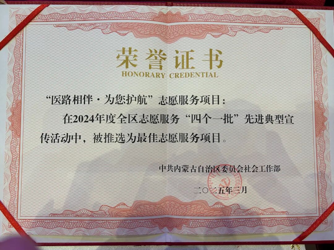 志愿耀北疆,社工谱芳华。2025年11月19日,由自治区党委社会工作部与自治区党委宣传部联合主办的全区志愿服务“四个一批”先进典型嘉许礼暨首届最美社会工作者发布活动在呼和浩特隆重举行。活动旨在弘扬“奉献、友爱、互助、进步”的志愿精神,营造全社会尊重、关爱社会工作者的良好氛围,为谱写中国式现代化内蒙古新篇章贡献社会工作力量。兴安盟人民医院“医路相伴·为您护航”志愿服务项目荣获自治区“四个一批”最佳志愿服务项目称号。