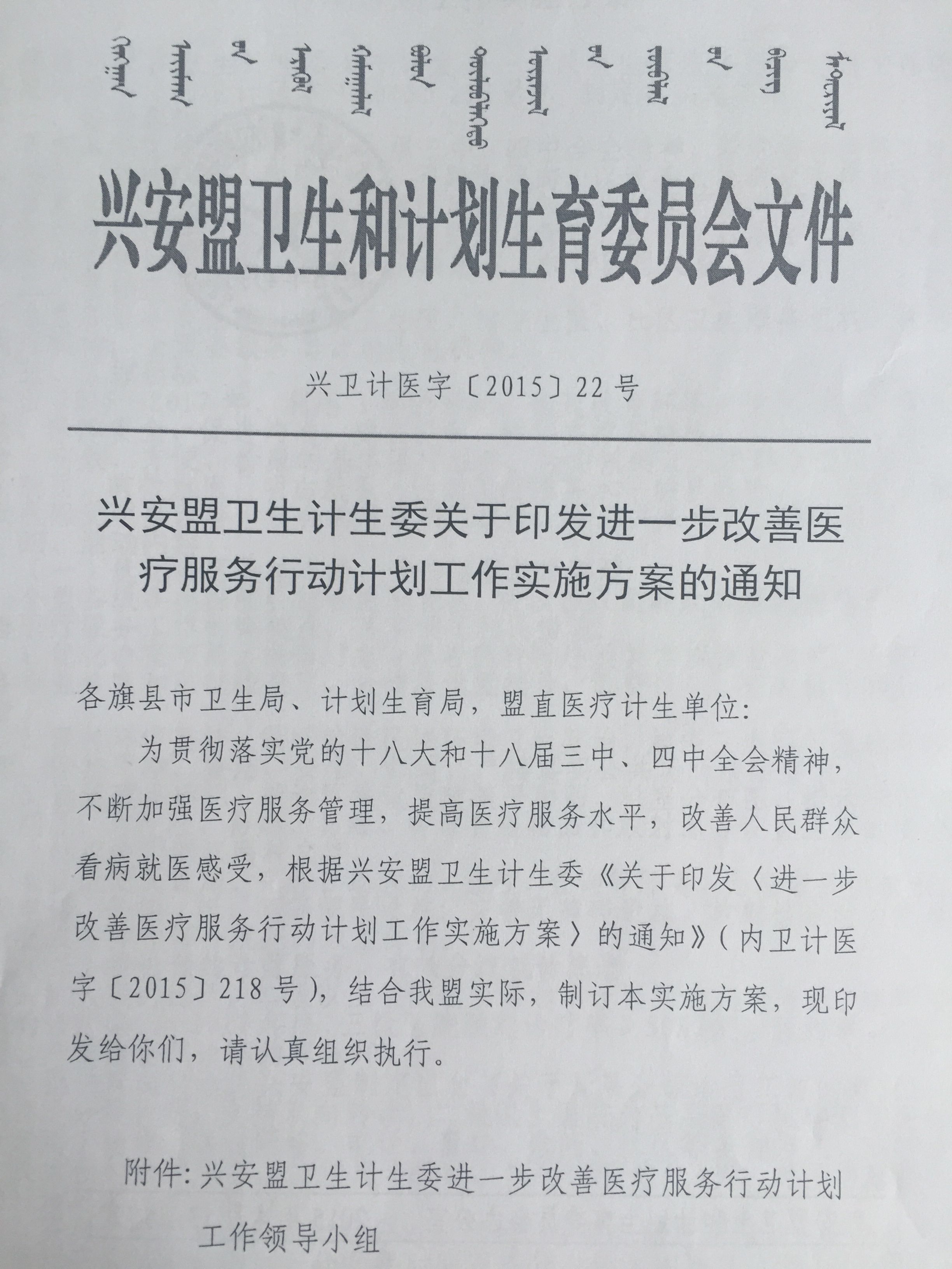 根据内蒙古卫生计生委关于印发进一步改善医疗服务行动计划工作实施方案的通知(内卫计医字〔2015〕218号),制定本实施方案。