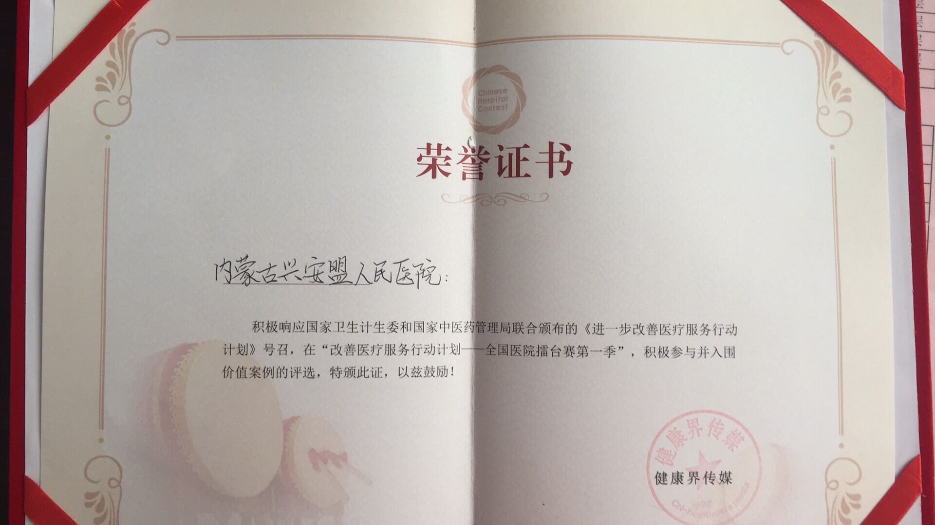 2015年1月,国家卫计委宣布在全国范围内开展为期三年的“进一步改善医疗服务行动计划”。健康界传媒在国家卫计委医政医管局的指导下,于2015年5月发起了“寻找最佳医疗实践——改善医疗服务行动计划全国医院擂台赛(第一季)”活动。擂台赛(第一季)共收到了来自全国27个省、市、自治区、直辖市的299家医院的672个案例。其中,兴安盟人民医院上传的4个参赛案例,包括“合理调配诊疗资源,发挥信息技术优势”、“住院患者健康教育及安全告知音视频的使用”、“加强优质护理内涵和外延建设,改善优质护理服务”、“规范临床诊疗行为”,在600多个案例中脱颖而出,参与了价值案例的评选,这是对我院在改善医疗服务行动方面工作的肯定,同时也对我院参加第二季、第三季活动起到了极大的鼓舞作用。