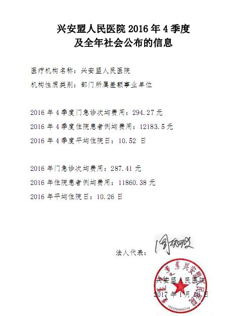 兴安盟人民医院2016年4季度及全年社会公布的信息