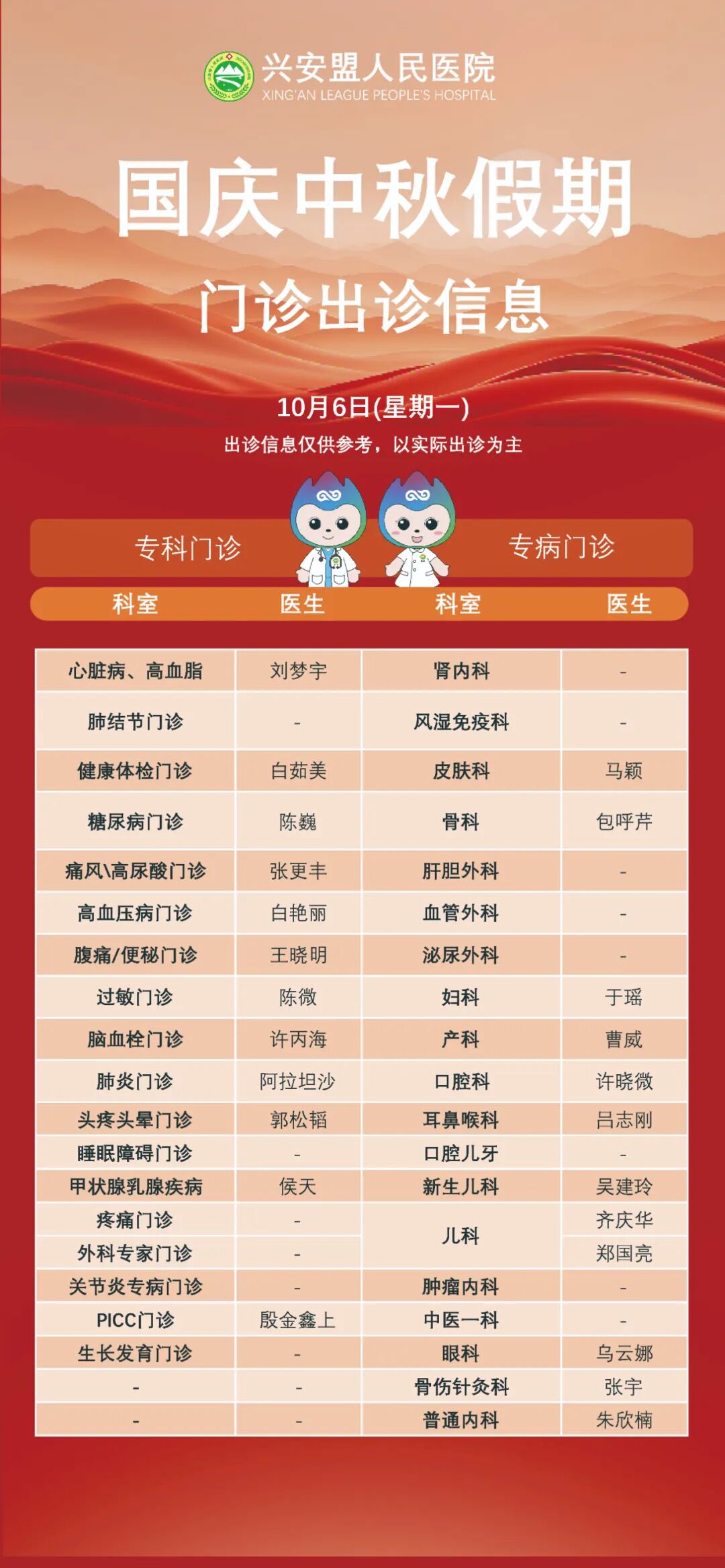 『出诊信息』兴安盟人民医院10月6日出诊信息
